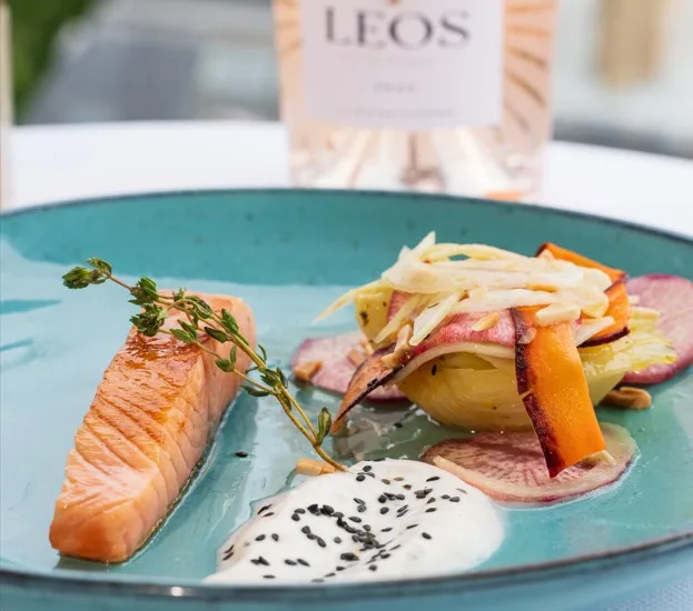 Découvrez le saumon mi-fumé, fenouil braisé à l’orange, rehaussé par le confit de thym du domaine de Leos.