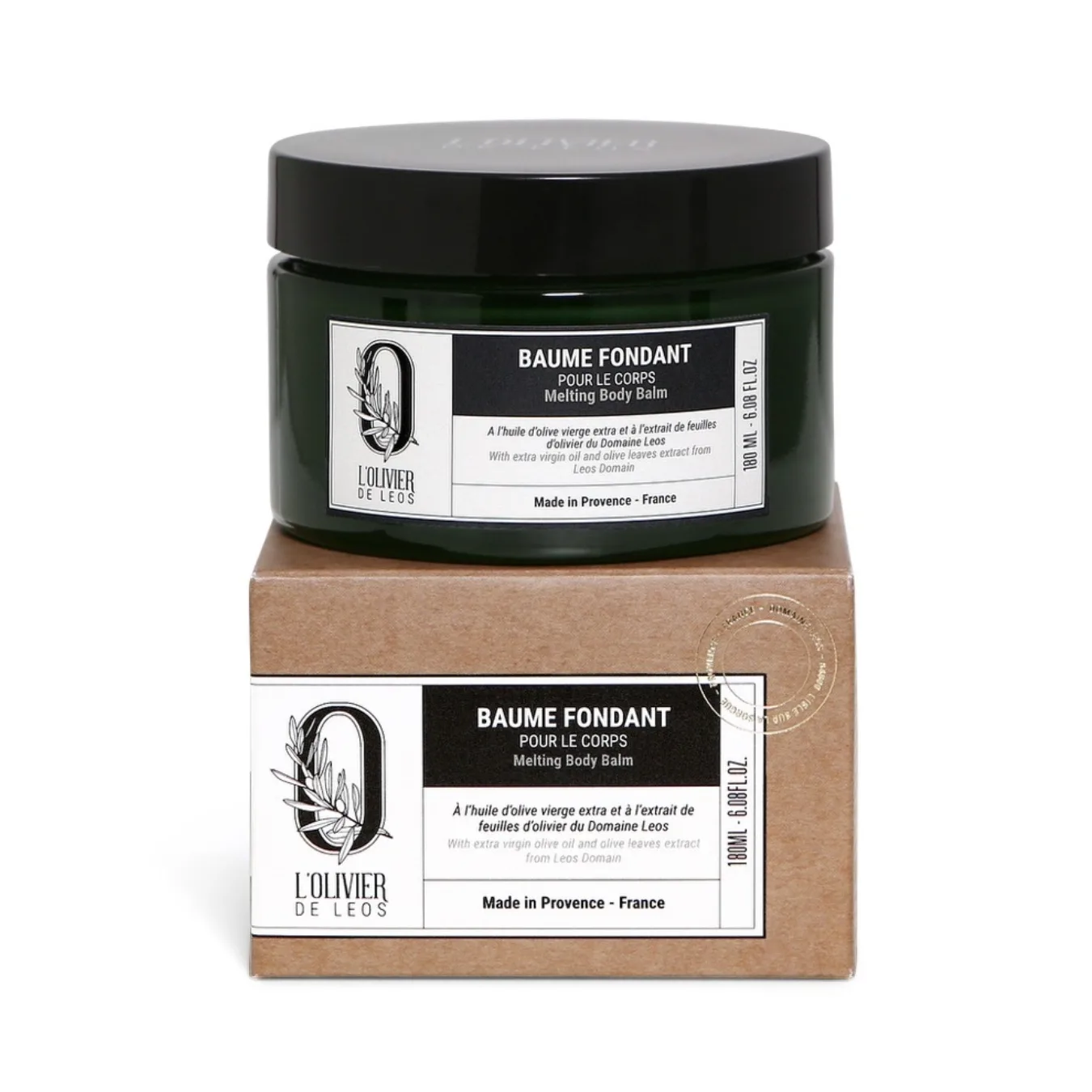Baume corps fondant intensément nourrissant, enrichi en beurres de karité et de cacao, et en précieux extraits d’olivier issus du Domaine de Leos, terroir d’exception en Provence. Sa formule sensorielle offre 8 heures d’hydratation prouvée, pour une peau visiblement plus souple, douce et confortable.