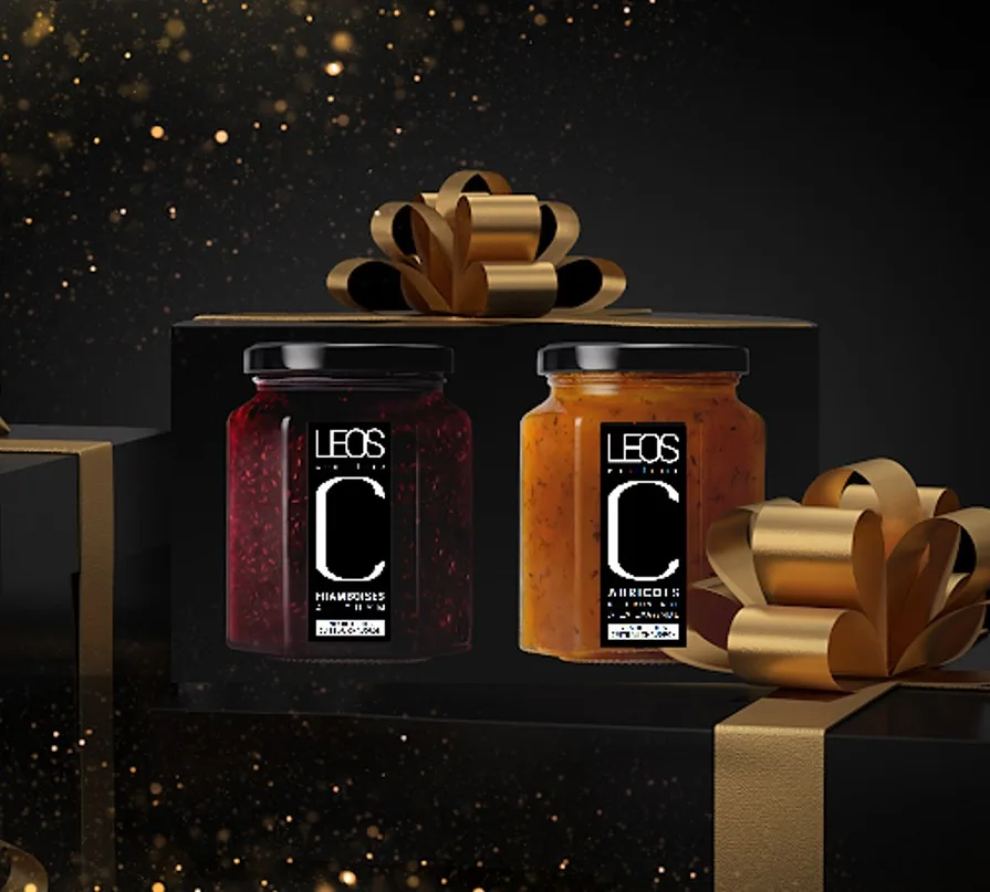 Un coffret à offrir pour faire découvrir deux confitures d’exception, élaborées avec 70% de fruits et relevées d’une touche subtile de thym sauvage du Domaine de Leos.