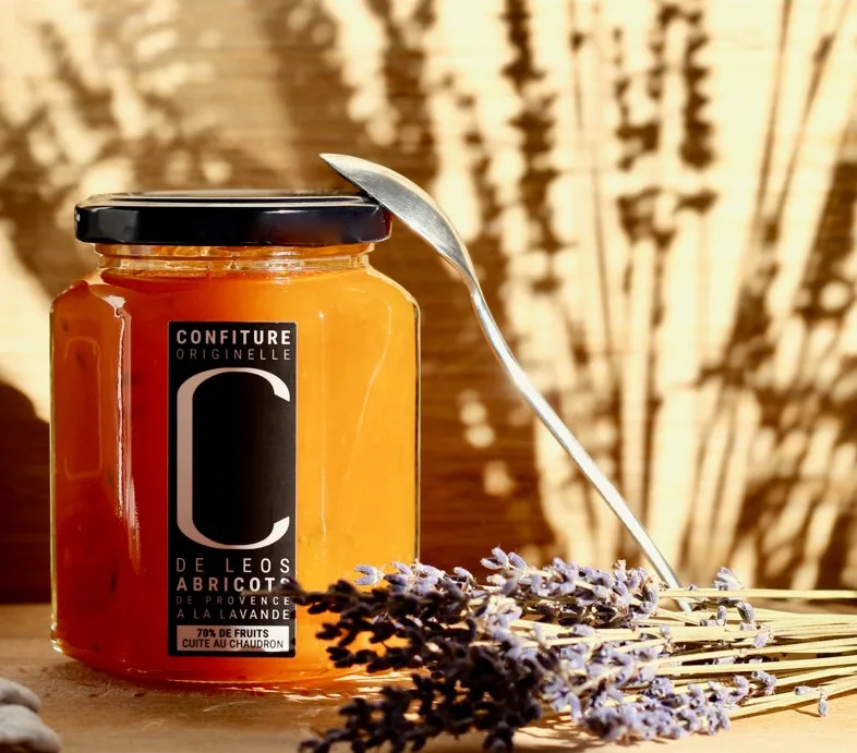 Confiture extra d’abricots à la lavande : texture généreuse, sucre maîtrisé, notes d’abricot mûr et de lavande du Domaine de Leos, finale douce-florale.
