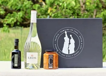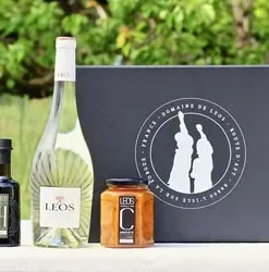 1 vin blanc Leos Cuvée Augusta (75 cl) – 1 huile d’olive H de Leos fruité vert (10 cl) – 1 confiture extra d’abricots de Provence Leos à la lavande (323 g).