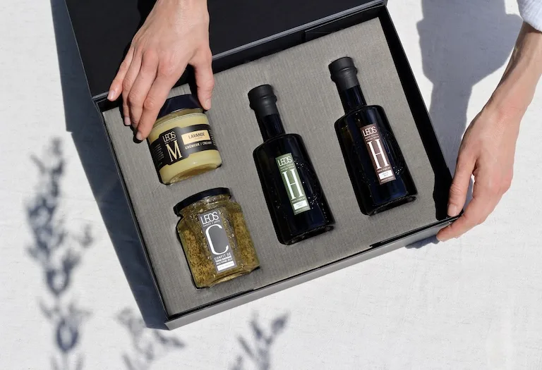 Composition : deux huiles d’olive H de Leos fruité vert et fruité mûr (25 cl / 250 ml), un confit de thym sauvage Leos (323 g) et un miel de lavande crémeux Leos (250 g)