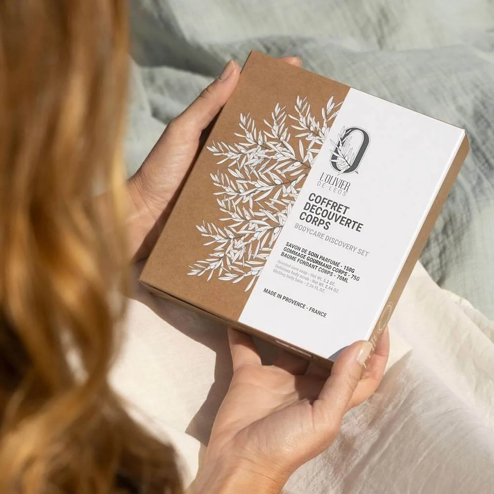 Ce coffret composé de soins naturels pour le corps, élégant, orné de branches d’olivier, regroupe trois essentiels pour prendre soin de votre peau : savon parfumé, gommage exfoliant et baume hydratant. Idéal pour une routine beauté à la fois douce et efficace, il garantit un résultat peau sublime et radieuse ! Parfait en cadeau pour faire découvrir les bienfaits des extraits d’olivier à vos proches… ou pour vous offrir une routine complète en format voyage, avec des produits compacts et pratiques à emporter partout. Le Coffret Découverte contient trois produits : Le Gommage Gourmand pour le Corps – 75g (format voyage) Le Baume Fondant pour le Corps – 70ml (format voyage) Après l’application de cette routine, votre peau est parfaitement nettoyée, gommée et hydratée : elle retrouve douceur, souplesse et éclat. Adoptez cette routine de soin en trois étapes pour une peau douce, hydratée et éclatante. Savon de Soin Parfumé : Gommage Gourmand pour le corps : Baume Fondant pour le corps : Baume fondant pour le corps • 9 femmes sur 10 déclarent que l’application du baume procure un véritable moment de bien-être. Test mené sur 20 femmes pendant 3 semaines avec 1 utilisation quotidienne. Enrichis en huile d’olive vierge extra et en extrait de feuilles d’olivier du Domaine de Leos. Savon de soin parfumé (mains, corps et visage) Liste d’ingrédients complète : SODIUM OLIVATE, SODIUM COCOATE, AQUA (WATER), SODIUM PALMITATE, SODIUM STEARATE, PARFUM (FRAGRANCE), GLYCERIN, SODIUM CHLORIDE, OLEA EUROPAEA (OLIVE) FRUIT OIL, PRUNUS AMYGDALUS DULCIS (SWEET ALMOND) OIL*, TETRASODIUM GLUTAMATE DIACETATE, LINALOOL, LIMONENE, GERANIOL, SODIUM HYDROXIDE, BENZYL SALICYLATE, OLEA EUROPAEA (OLIVE) LEAF EXTRACT Gommage gourmand pour le corps Liste d’ingrédients complète : PRUNUS AMYGDALUS DULCIS (sweet almond) OIL – SUCROSE – HYDRATED SILICA – CAPRYLIC/CAPRIC TRIGLYCERIDE – OLEIC/LINOLEIC/LINOLENIC POLYGLYCERIDES – OLEA EUROPAEA (olive) FRUIT OIL – PARFUM (fragrance) – LAURYL GLUCOSIDE – POLYGLYCERYL-2 DIPOLYHYDROXYSTEARATE – OLEA EUROPAEA (olive) SEED POWDER – OLEA EUROPAEA (olive) LEAF EXTRACT – PRUNUS ARMENIACA (apricot) SEED POWDER – PRUNUS AMYGDALUS DULCIS (sweet almond) SHELL POWDER* – COCOS NUCIFERA (coconut) SHELL POWDER – GLYCERIN – AQUA (water) – KAOLIN – TOCOPHERYL ACETATE – CITRIC ACID – LIMONENE Baume fondant pour le corps Liste d’ingrédients complète : PRUNUS AMYGDALUS DULCIS (sweet almond) OIL – SUCROSE – HYDRATED SILICA – CAPRYLIC/CAPRIC TRIGLYCERIDE – OLEIC/LINOLEIC/LINOLENIC POLYGLYCERIDES – OLEA EUROPAEA (olive) FRUIT OIL – PARFUM (fragrance) – LAURYL GLUCOSIDE – POLYGLYCERYL-2 DIPOLYHYDROXYSTEARATE – OLEA EUROPAEA (olive) SEED POWDER – OLEA EUROPAEA (olive) LEAF EXTRACT – PRUNUS ARMENIACA (apricot) SEED POWDER – PRUNUS AMYGDALUS DULCIS (sweet almond) SHELL POWDER* – COCOS NUCIFERA (coconut) SHELL POWDER – GLYCERIN – AQUA (water) – KAOLIN – TOCOPHERYL ACETATE – CITRIC ACID – LIMONENE Le savon peut-il être utilisé sur le visage ? Quels sont les bienfaits spécifiques de l’huile d’olive dans ces produits ? INFORMATIONS TECHNIQUES Actifs Leos : huile d’olive vierge extra et feuilles d’olivier