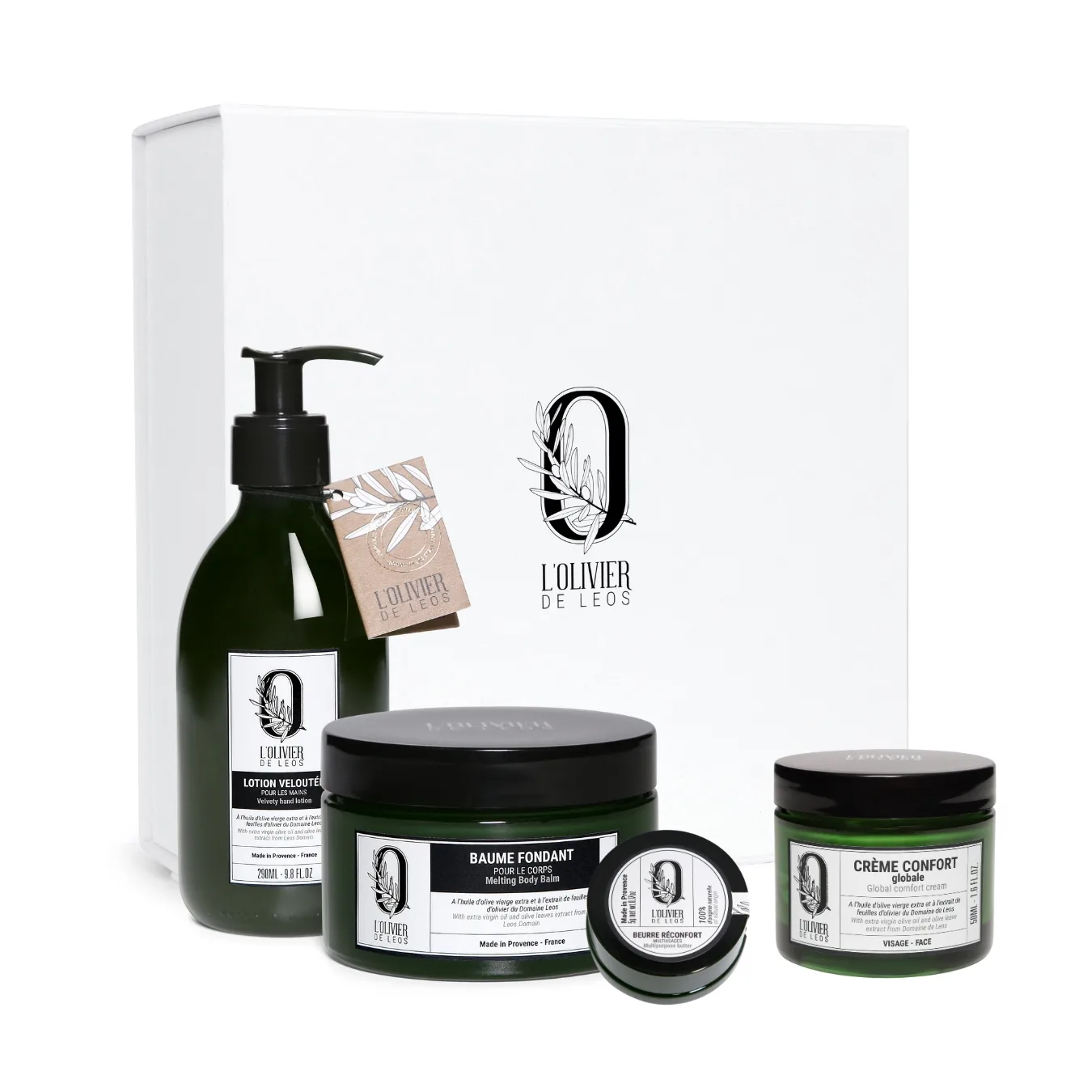 Crème Confort, Baume Fondant, Lotion Veloutée et Beurre Réconfort : ces soins naturels aux textures irrésistibles enveloppent votre peau de douceur et de bien-être. Chaque produit nourrit, hydrate et réconforte, pour une peau visiblement plus belle, souple et confortablement protégée, de la tête aux pieds ! Le Coffret Total Confort comprend : Le tout est présenté dans un élégant coffret signé, fermé par un nœud en coton. Un cadeau parfait pour offrir confort et douceur ! Pour une peau durablement hydratée et protégée, utilisez quotidiennement les soins hydratants L’Olivier de Leos, matin et/ou soir : ● Visage : Appliquez la Crème Confort Globale sur le visage et le cou en massant doucement jusqu’à absorption complète. ● Corps : Étalez généreusement le Baume Fondant sur le corps en lissages, idéal après la douche. ● Mains : Appliquez la Lotion Veloutée au quotidien sur les mains et cuticules, aussi souvent que nécessaire. ● Zones sèches : Appliquez le Beurre Réconfort sur les zones sèches (coudes, talons, lèvres) pour nourrir et apaiser. Crème Confort Globale Test réalisé sur 23 femmes pendant 28 jours, avec 2 applications quotidiennes (matin et soir), pour tous types de peaux. Baume Fondant pour le Corps Test mené sur 20 femmes pendant 3 semaines avec une application quotidienne. Enrichis en huile d’olive vierge extra et en extrait de feuilles d’olivier du Domaine de Leos. Crème Confort Globale Liste d’ingrédients complète : AQUA (WATER), ISOPROPYL PALMITATE, CETEARYL ALCOHOL, BUTYROSPERMUM PARKII (SHEA) BUTTER*, GLYCERIN, OLEA EUROPAEA (OLIVE) FRUIT OIL, SIMMONDSIA CHINENSIS (JOJOBA) SEED OIL, SQUALANE, ZEA MAYS (CORN) STARCH*, DICAPRYLYL ETHER, ETHYLHEXYL PALMITATE, CETEARETH-20, GLYCERYL STEARATE, AVENA SATIVA (OAT) KERNEL EXTRACT**, SECALE CEREALE (RYE) SEED EXTRACT*, OLEA EUROPAEA (OLIVE) LEAF EXTRACT, SODIUM BENZOATE, SODIUM STEAROYL GLUTAMATE, ETHYL LAUROYL ARGINATE HCL, LUFFA CYLINDRICA SEED OIL, CARBOMER, SODIUM HYALURONATE, SODIUM HYDROXIDE, TOCOPHEROL, GLYCINE SOJA (SOYBEAN) OIL, PARFUM FRAGRANCE), LIMONENE, ALPHA-ISOMETHYL IONONE Baume Fondant pour le corps Liste d’ingrédients complète : AQUA (WATER) – GLYCERYL STEARATE SE – GLYCERIN – ISOPROPYL PALMITATE – BUTYROSPERMUM PARKII (SHEA) BUTTER* – PRUNUS AMYGDALUS DULCIS (SWEET ALMOND) OIL* – GLYCERYL STEARATE – BRASSICA GLYCERIDES – OLEA EUROPAEA (OLIVE) FRUIT OIL – UNDECANE – PARFUM (FRAGRANCE) – PALMITIC ACID – THEOBROMA CACAO SEED BUTTER* – CETYL ALCOHOL – OLEA EUROPAEA (OLIVE) LEAF EXTRACT – STEARIC ACID – TRIDECANE – ZEA MAYS (CORN) STARCH* – CHLORPHENESIN – XANTHAN GUM – 1,2-HEXANEDIOL – CAPRYLYL GLYCOL – HYDROXYETHYL ACRYLATE/SODIUM ACRYLOYLDIMETHYL TAURATE COPOLYMER – O-CYMEN-5-OL – SQUALANE – CITRIC ACID – SODIUM HYDROXIDE – POLYSORBATE 60 – TOCOPHEROL – SORBITAN ISOSTEARATE – OLUS (VEGETABLE) OIL – LIMONENE Lotion Veloutée pour les mains Liste d’ingrédients complète : AQUA (WATER) – BUTYROSPERMUM PARKII (SHEA) OIL – GLYCERIN – OLEA EUROPAEA (OLIVE) FRUIT OIL – SODIUM POLYACRYLATE – PARFUM (FRAGRANCE) – TRITICUM VULGARE (WHEAT) STARCH – OLEA EUROPAEA (OLIVE) LEAF EXTRACT – SODIUM STEAROYL GLUTAMATE – CHLORPHENESIN – 1,2-HEXANEDIOL – CAPRYLYL GLYCOL – TROPOLONE – LIMONENE Beurre Réconfort Liste d’ingrédients complète : BUTYROSPERMUM PARKII (shea) BUTTER – OLEA EUROPAEA (olive) FRUIT OIL – HYDROGENATED olive OIL – THEOBROMA CACAO SEED BUTTER* – OLEA EUROPAEA (olive) LEAF EXTRACT – TOCOPHEROL – OLUS (vegetable) OIL*Ingrédients issus de l’agriculture biologique Peut-on utiliser tous les produits en même temps ? INFORMATIONS TECHNIQUES Actifs Leos : huile d’olive vierge extra et feuilles d’olivier