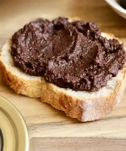 Composition : Olives noires Tanches (France) 95 % (pulpe), sel, huile d’olive vierge extra H de Leos (fruité mûr), vinaigre balsamique (sulfites), thym, jus de citron concentré.