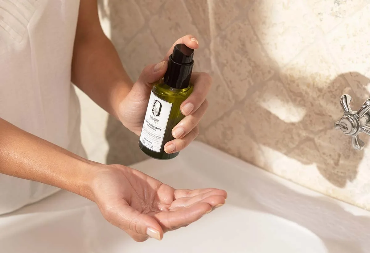 Chauffez une noisette d’huile nettoyante entre vos paumes, puis appliquez sur peau sèche en effectuant des massages circulaires, en particulier sur les zones maquillées (yeux, lèvres). Ajoutez un peu d’eau pour transformer l’huile en une émulsion lactée, puis rincez soigneusement à l’eau tiède.
