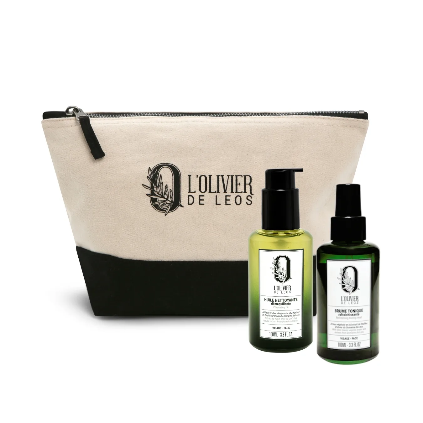 Ce duo réunit deux essentiels du rituel visage L’Olivier de Leos : des soins naturels aux textures sensorielles et aux parfums délicats. L’Huile Nettoyante Démaquillante et la Brume Tonique Rafraîchissante offrent un nettoyage en deux temps, pour une peau nette, fraîche et apaisée. Le tout présenté dans une élégante trousse zippée en coton.